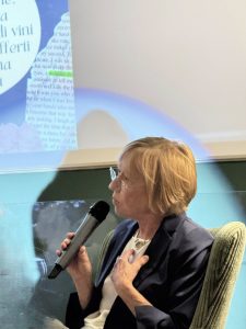 Nel suo racconto emerge poi un altro elemento fondativo della sua scrittura: il vino, che definisce “la poesia della terra”. La scrittrice ricorda la fatica e la dedizione necessarie per portare una bottiglia di vino sulla tavola e collega questa esperienza al significato originario della parola “poesia”, che dal greco poieō rimanda al fare, al creare. Il vino, come la poesia, nasce dall’amore, dalla creatività e da un dialogo profondo con la natura, che va ascoltata, rispettata e accompagnata nei suoi ritmi. È poesia anche perché affonda le sue radici nel mito, nella figura di Dioniso, simbolo di vitalità, trasformazione ed estasi. Per questo, afferma, il vino è a pieno titolo un’espressione culturale e poetica.