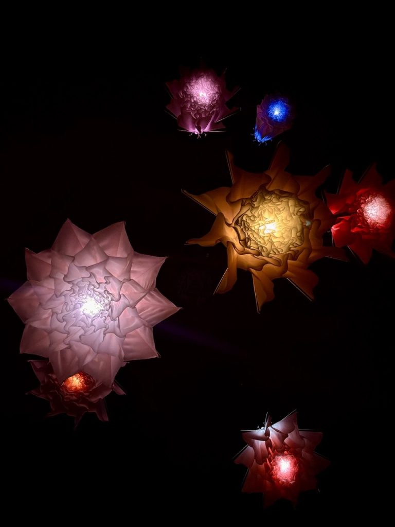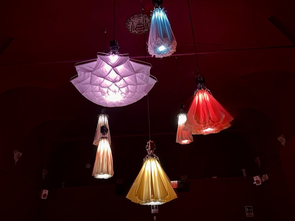 La mostra si conclude con l’installazione cinetica “Meadow”, 2024, di Studio Drift. Una serie di fiori sospesi ed illuminati da lampade led sembrano danzare seguendo il ritmo della musica. Il loro movimento riproduce il fiorire di un ciclo vitale che i viaggiatori possono ammirare distendendosi su un ampio divano.